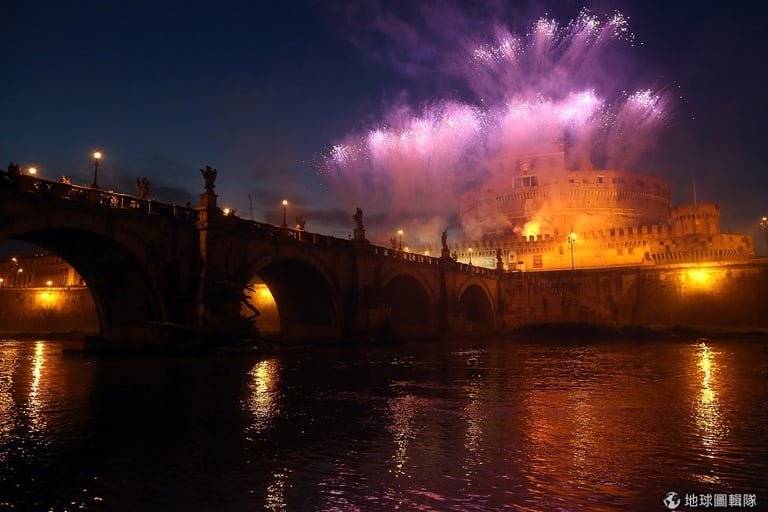粉紅色的煙火在聖天使城堡(Castel Sant'Angelo)上空綻開。