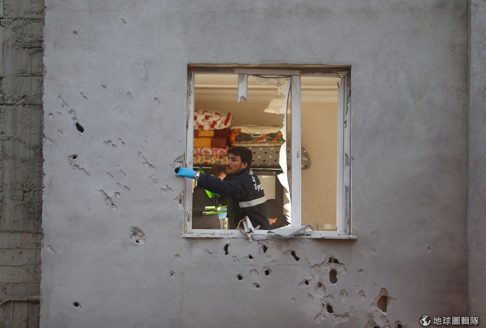 在和敘利亞交界的基利斯鎮(Kilis),鑑識人員正在採集樣本,這棟建築物被從敘利亞發射出來的火箭波及。