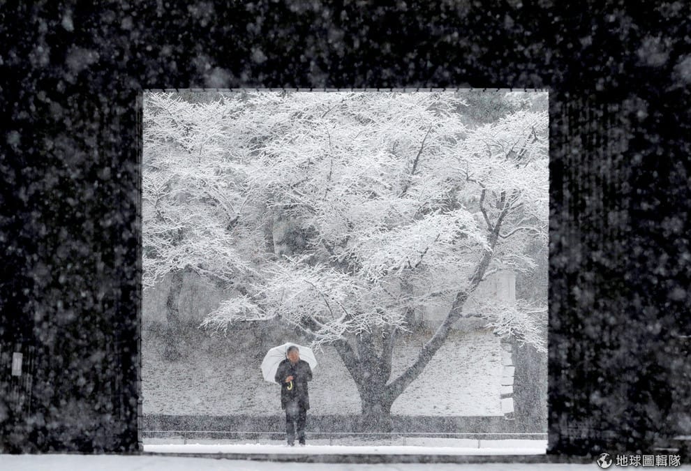 在東京皇居,一名男子在漫天大雪下撐傘而行,他身後的樹木早已被積雪給染白。