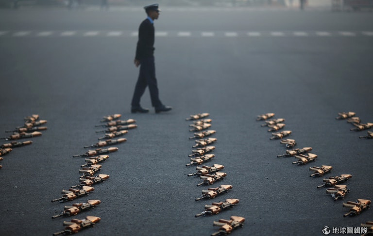 在首都新德里,一名軍人緩步走過地上成排的來福槍,他們正在為印度共和日遊行彩排。