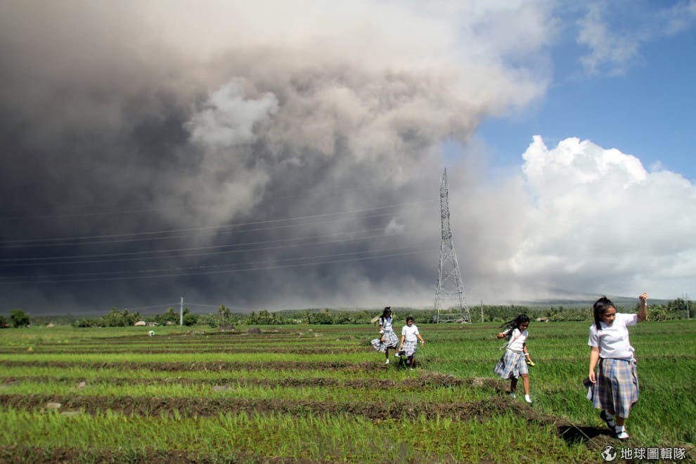 在阿爾拜省(Albay),學生們穿過稻田慌張地跑回家,逃離遠處馬永火山(Mayon Volcano)噴發而出的火山灰。
