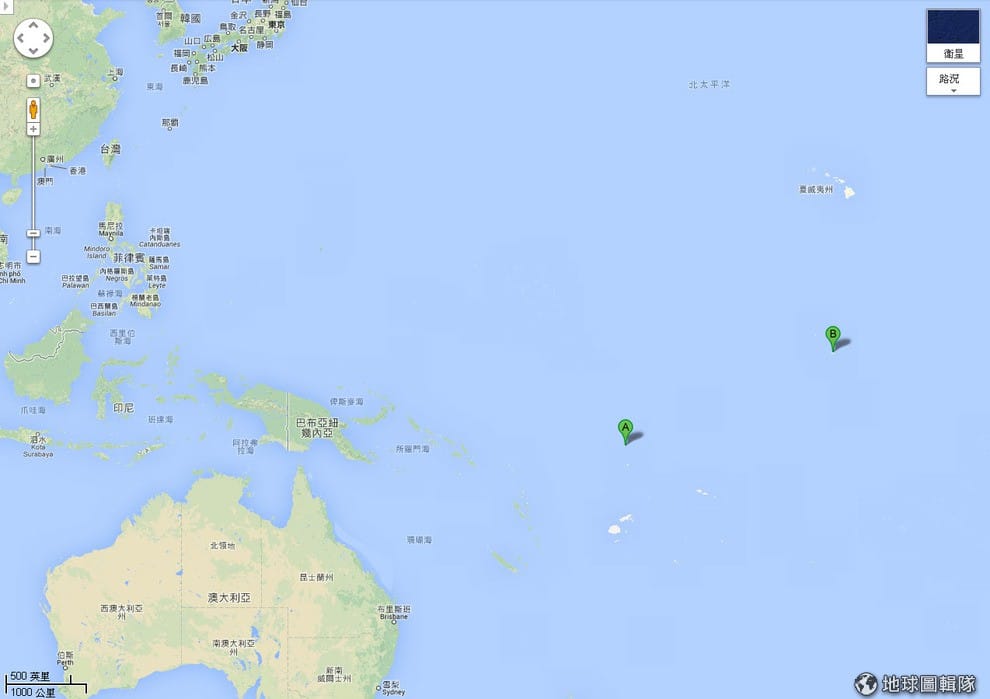 照片中的A點就是吐瓦魯,位置在南太平洋地區;B點則是吉里巴斯,位置處在中南太平洋地區。