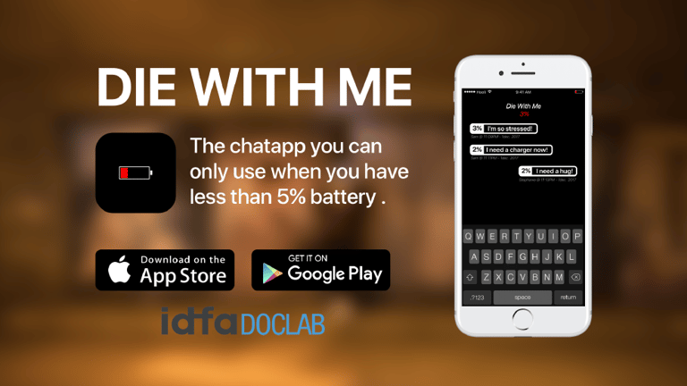 歡迎來到這款聊天室app「生死與共」(Die with Me),跟一般聊天室不一樣的是,它只有在你的手機剩下 5%電力時才打得開,如果你讓手機充超過 5%的電力就會自動被踢出聊天室。在這個聊天室裡,你將會看到許多手機電力即將耗盡的同伴,享受他們在線上的最後一刻。