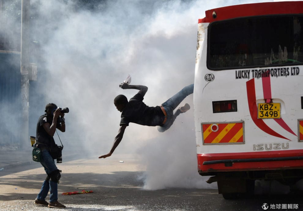 反對黨領袖歐丁嘉(Raila Odinga)的支持者側身從巴士上跳下來,試圖躲避鎮暴警察所發射的催淚瓦斯,在一旁的攝影師自然不會錯過這一刻。歐丁嘉雖然沒有當選為肯亞總統,但在本月 30號,他決定進行一場模擬就職典禮。