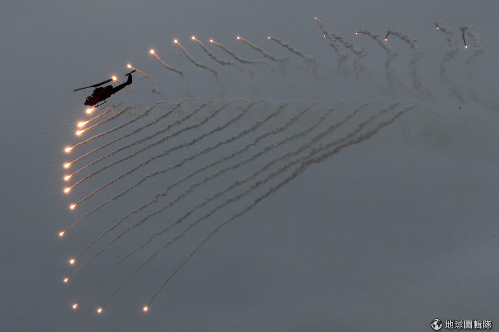 在花蓮的軍事基地,一架AH-1W蝰蛇直升機正在進行「閃避敵方飛彈追蹤」的軍事訓練。