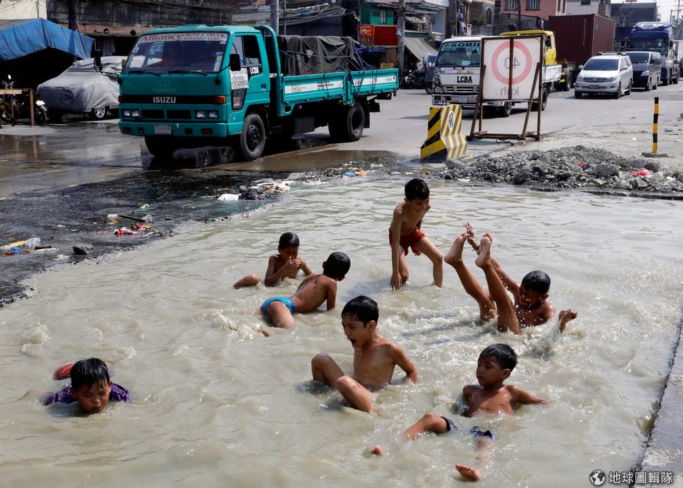 在馬尼拉街頭,孩子們在路旁的水坑開心地玩水。