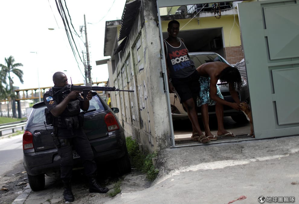 在里約熱內盧的貧民窟,警察全副武裝準備緝毒,一旁的民眾對這樣的景象早已見怪不怪。
