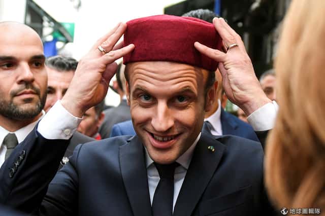 在首都突尼斯(Tunis)的舊市街,法國總統馬克宏(Emmanuel Macron )正在試戴紅色的穆斯林毯帽(Fez)。根據《維基百科》,這種帽子常見於土耳其和北非等前鄂圖曼帝國統治下的穆斯林地區。在20世紀初鄂圖曼帝國解體之前,土耳其毯帽一直被西方人視為東方穆斯林的象徵。