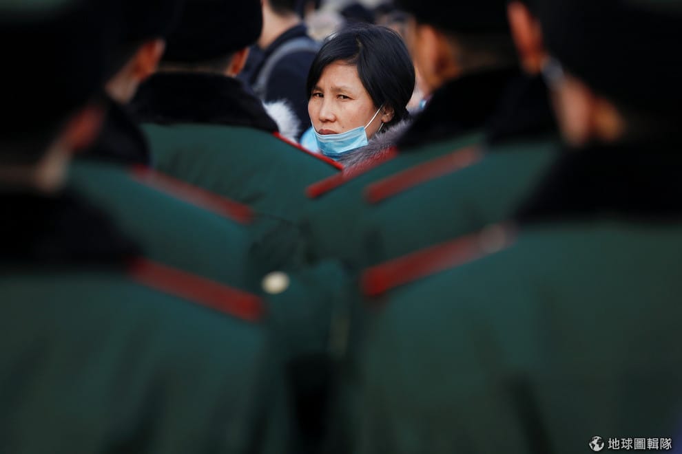 一名戴著口罩的乘客轉頭看著身後的公安。隨著春節的腳步越來越接近,北京火車站也陸陸續續出現提早返鄉的人潮,當局也派出重重警力維安。