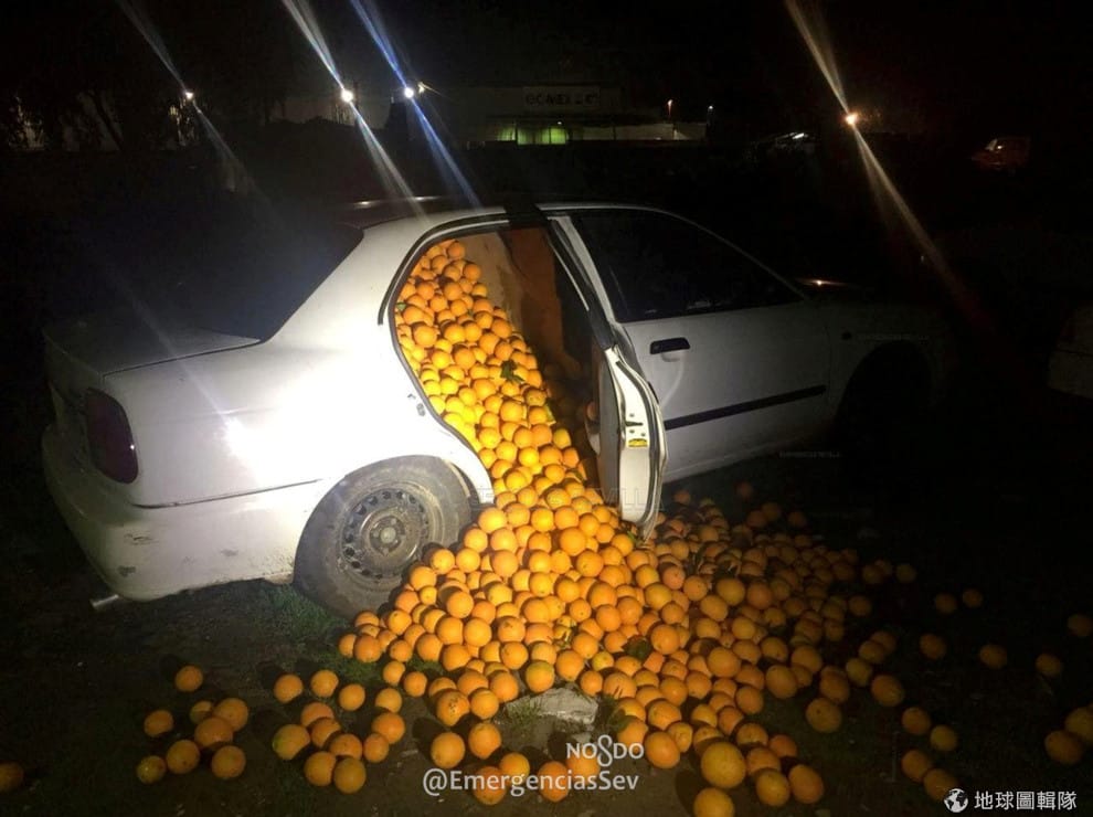 在南部塞維亞(Seville),滿車被偷的橘子滾下車來。根據報導,五名嫌犯聲稱這些橘子是地上撿的,隨後被戳破是他們從倉庫偷來的。