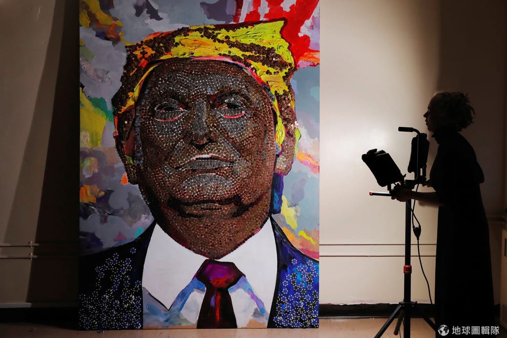 在紐約市,美國藝術家瑪錢科(Daria Marchenko)正在介紹她和另一名藝術家葛林(Daniel D. Green)的作品一用錢幣和賭場籌碼做成的美國總統川普(Donald Trump )肖像畫。