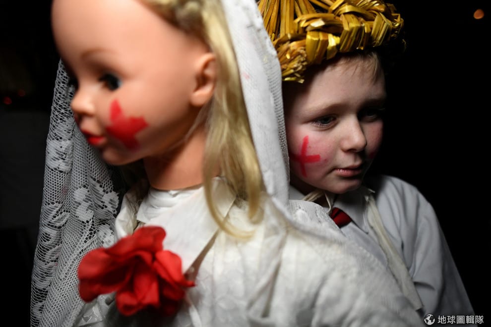 一名 12歲的女孩抱著跟她差不多大的雕像娃娃,準備去參加迎接春天來臨的傳統節慶。