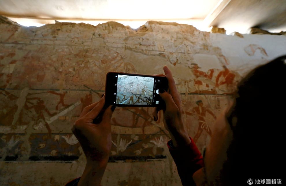 一名記者用手機把眼前的壁畫拍了下來。在吉薩金字塔(Giza)附近,考古學家於近日發現了官位很高的女祭司海特佩特(Hetpet)的墳墓,他們相信這是來自埃及第五王朝。