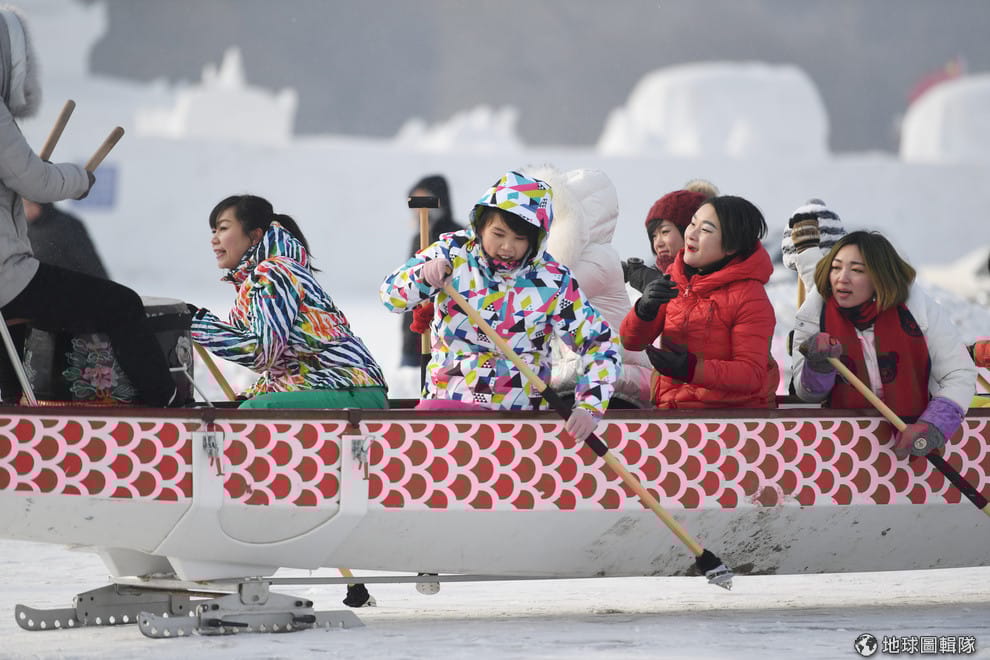 吉林省一座結冰的湖面上,人們替龍舟裝上冰刀,進行了不一樣的龍舟競賽。