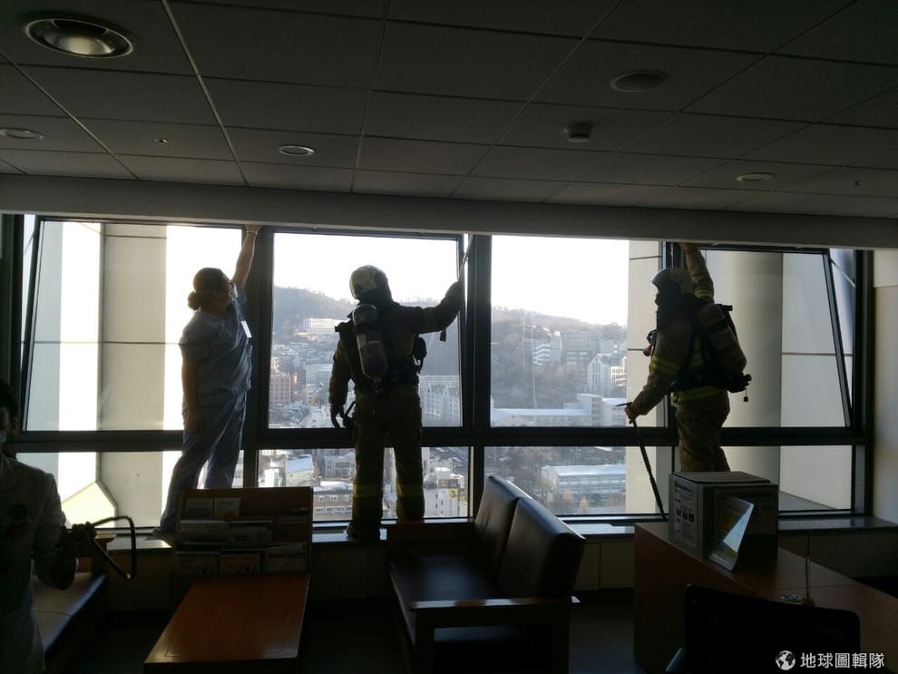 救難人員正在協助疏通大火引起的煙霧。3號早晨,首爾延世大學附屬醫院(Severance hospital)發生火災,事發當時讓院方緊急疏散上百名病患和家屬,整起事件造成 8人嗆傷,無人死亡。