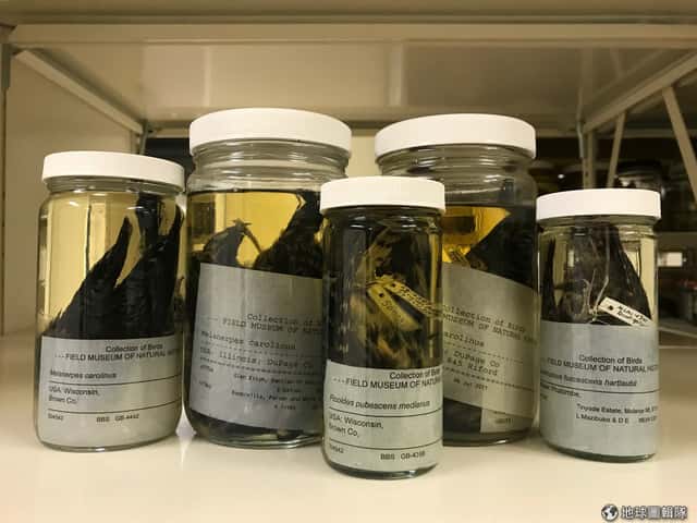 在美國芝加哥的田野博物館內,一隻隻啄木鳥遺體被安置在裝滿酒精的罐子中。
