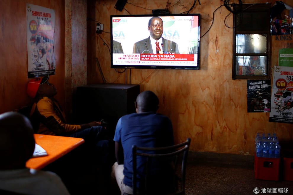 去年 8月16日,肯亞首都奈洛比的貧民窟裡,民眾觀看著歐丁嘉的記者會。