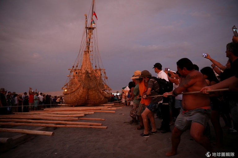 人們正努力要把船隻「維拉科查三號」(Viracocha III)拉到海岸邊。這艘船全部由蘆葦編織而成,且即將展開一場橫跨太平洋、前往澳洲的旅程。整趟行程預計會花上 6個月的時間。