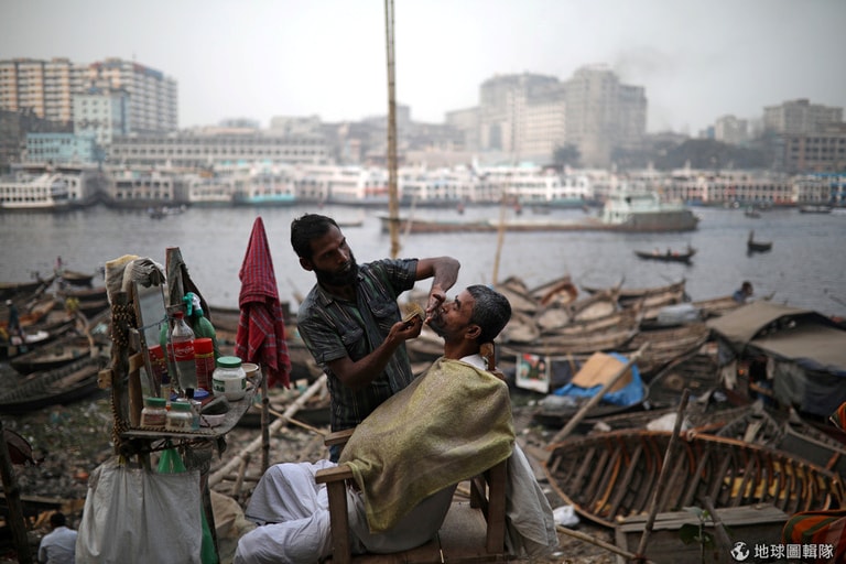 在孟加拉的河畔旁 ,一名男子正接受著一名街頭理髮師幫忙修剪鬍子。