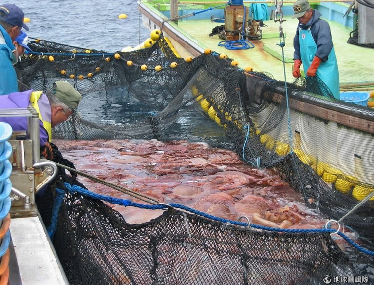 照片中是日本的漁民,大量激增的巨型水母影響了他們的捕撈作業。這些巨型水母(f Echizen kurage)最大可以長到2公尺、達到200公斤重,常造成漁網破裂、堵塞進水口等問題。