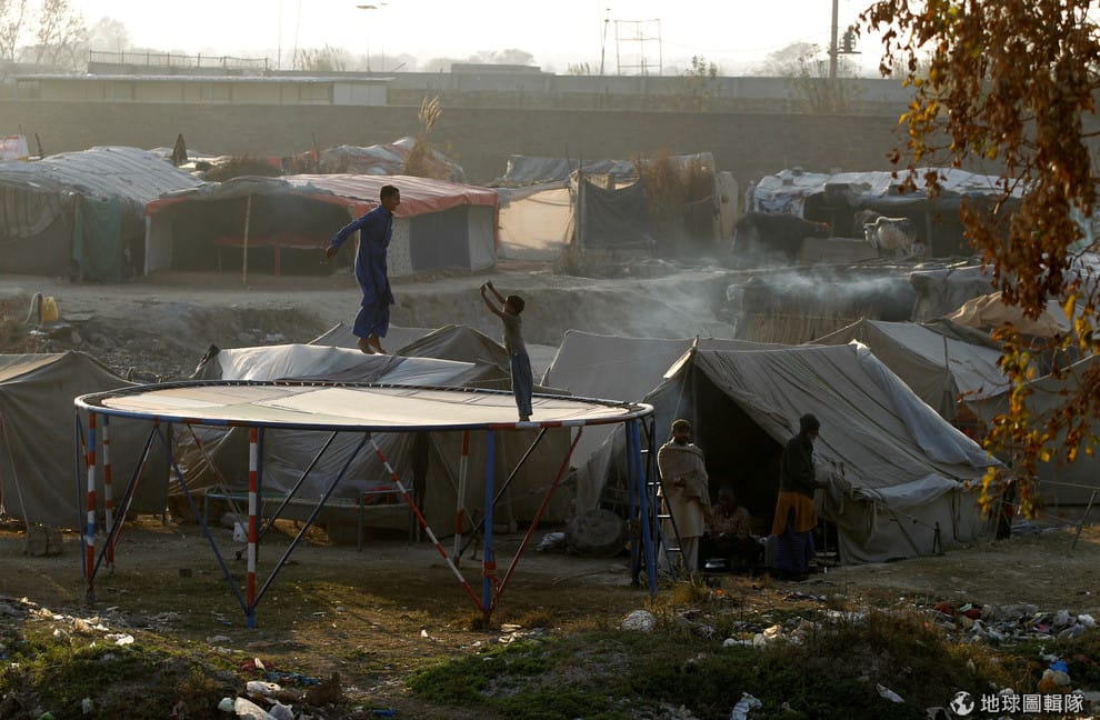 在巴基斯坦近郊的貧民窟,兩名小孩雀躍地在彈簧墊上玩耍著。