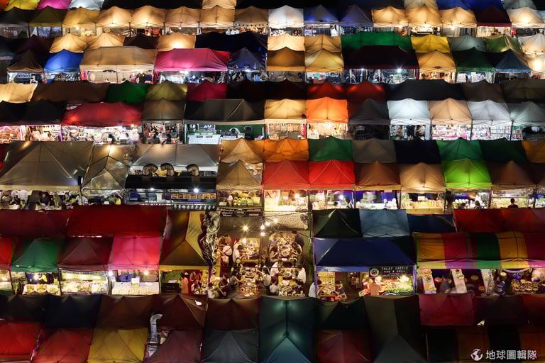 在泰國曼谷的市場內,人們坐在自家帳棚內享受著晚餐。