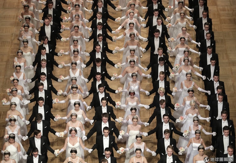 大量的華爾滋舞者站定位子,準備為維也納歌劇院舞會(Vienna Opera Ball)開場。