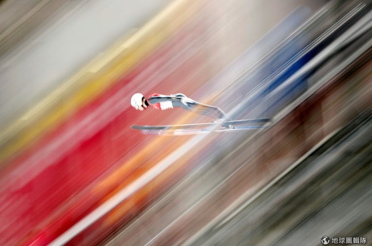 在平昌的亞洲阿爾卑斯滑雪中心,一名滑雪好手正在進行跳躍練習,在跳躍瞬間形成的速度感通通被鏡頭精準地捕捉了下來。