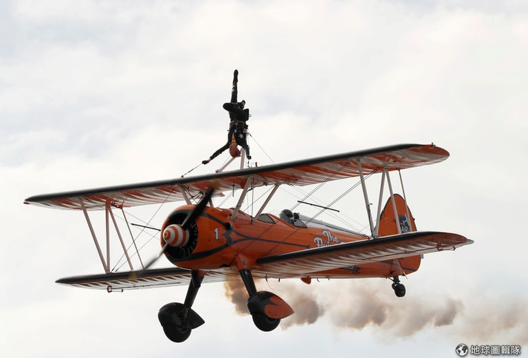 在菲律賓第 22屆的國際熱氣球開場典禮上,一名「機翼行走者」(Wingwalkers)正在小型飛機上大秀特技。