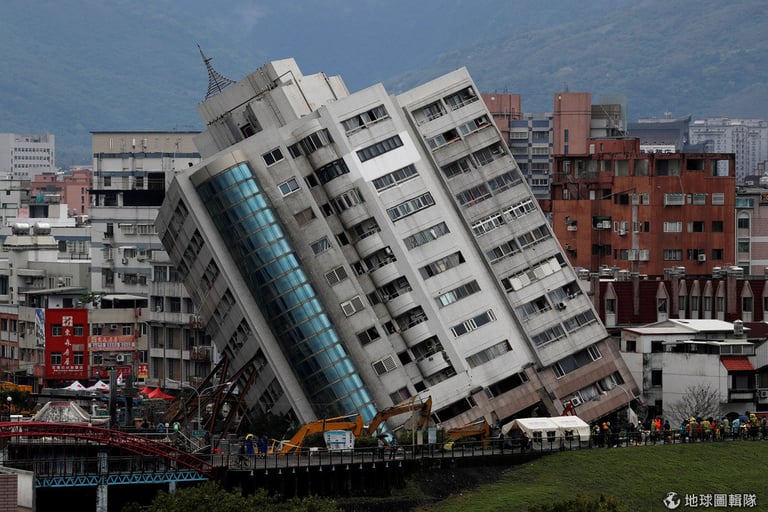 面對瀕臨倒塌邊緣的花蓮雲翠大樓,救難人員忙著搜尋生還者。本月 6號,接近凌晨時分,花蓮近海發生規模 6、震度達 7級的地震,造成數棟建築因此損毀甚至倒塌。截至目前為止,這起地震已經造成 12人死亡、277人受傷、5人失蹤。