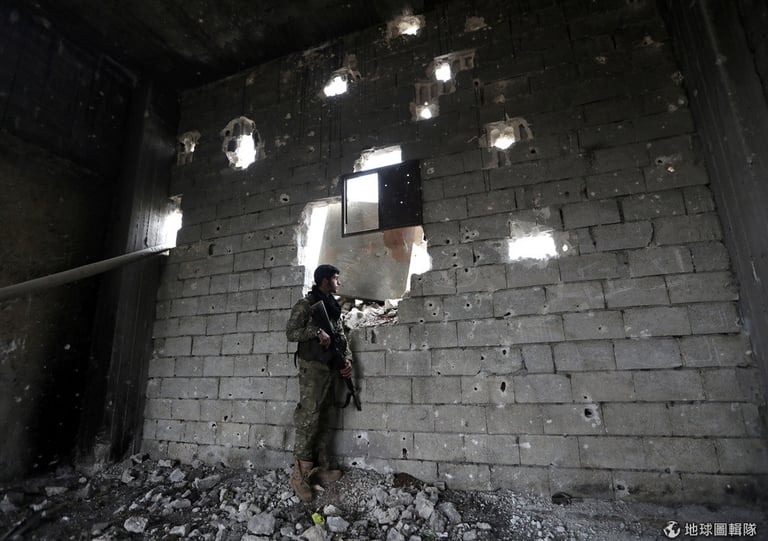 在阿勒坡省(Aleppo)北部城鎮,一名由土耳其支持的敘利亞自由軍成員正持槍警戒著。