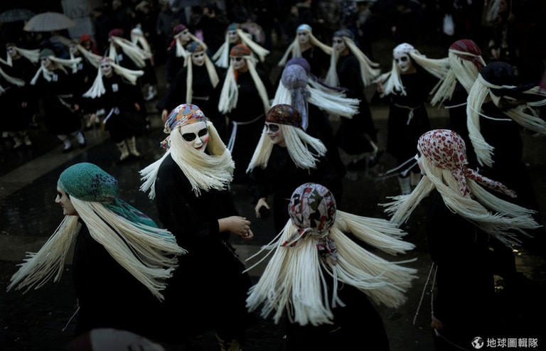 位於巴斯克自治區(Basque)的城鎮蒙達卡(Mundaka)正在舉辦嘉年華,只見人們把臉塗白、塗上黑眼圈,打扮成神話人物「拉米亞」(Lamia),一同在大街上唱歌跳舞。
