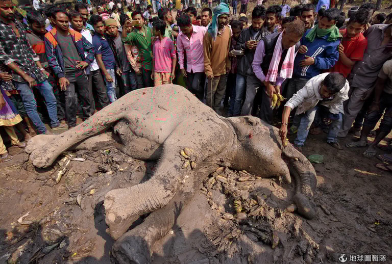在印度東北部城鎮霍賈伊(Hojai),一名男子正在餵食受傷的母象。根據林務局報導,牠與另外 4隻大象在橫越鐵軌時,遭到載客列車衝撞,造成其中 4隻大象死亡,另外 1隻大象仍在搶救當中(無法確認是否為畫面中的大象)。