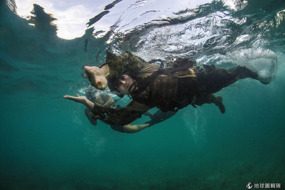 在美國關島海軍基地(Naval Base Guam),一名海軍官員正在進行負重游泳訓練。