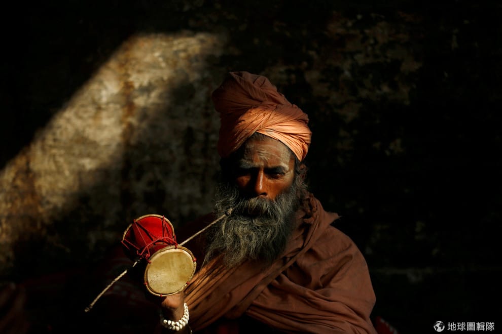 在一年一度的濕婆節(Maha Shivaratri festival)前夕,一名印度聖僧(Sadhu,又稱苦行僧)正在以鼓奏樂。