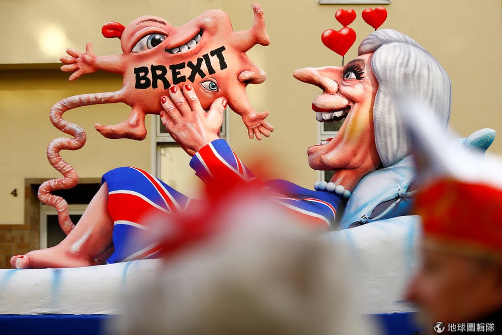 在德國傳統嘉年華「玫瑰星期一」(Rosenmontag)上,一尊諷刺英國脫歐(Brexit)的花車行走在遊行隊伍間。