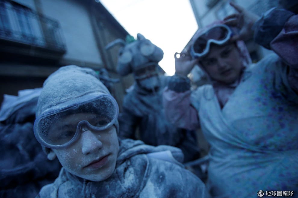 渾身麵粉的參加者被攝影師捕捉下來。西班牙拉薩(Laza)地區迎來了為期 7天的狂歡節(O Entroido),其中麵粉大戰可說是少不了的傳統之一。