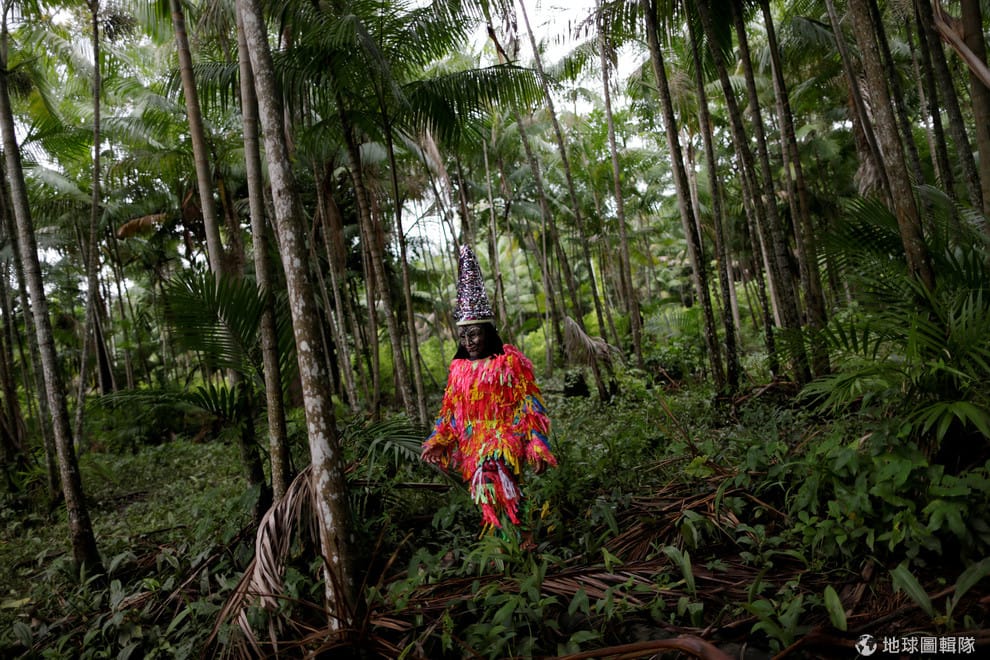 一名打扮鮮豔的嘉年華參加者站在林地之間,準備去參加「水之嘉年華」(Carnival of the Waters),該活動會把色彩鮮豔、擺滿裝飾的船隻擺到帕卡雅河(Pacaja)上。