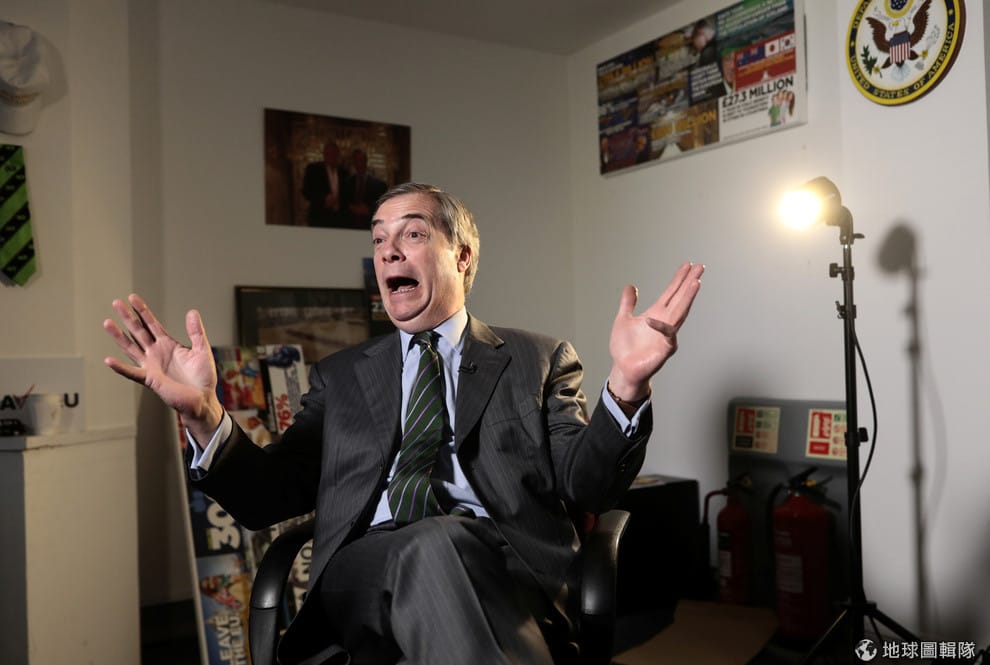 前英國獨立黨(UKIP)黨魁法拉吉(Nigel Farage)正在接受《路透社》訪問,這裡是法拉吉位於西敏市(Westminster)的辦公室。