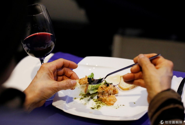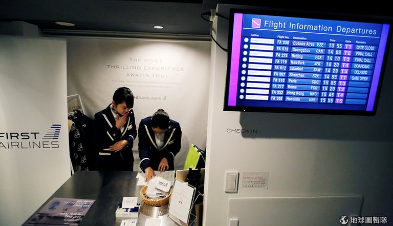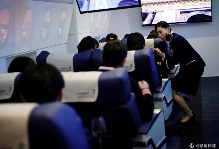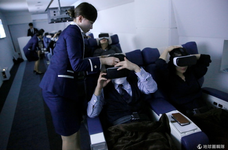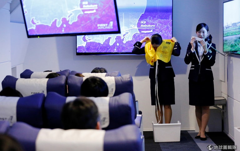 這裡是位於池袋的公司「頭等艙」(First Airlines),現在有 12名乘客正在這裡一邊享受頭等艙和商務艙的座位,一邊享受由空服人員附上有四道菜的晚餐,並戴上 360度全真體驗的虛擬實境(virtual reality, VR)頭套,準備「啟程」前往巴黎。