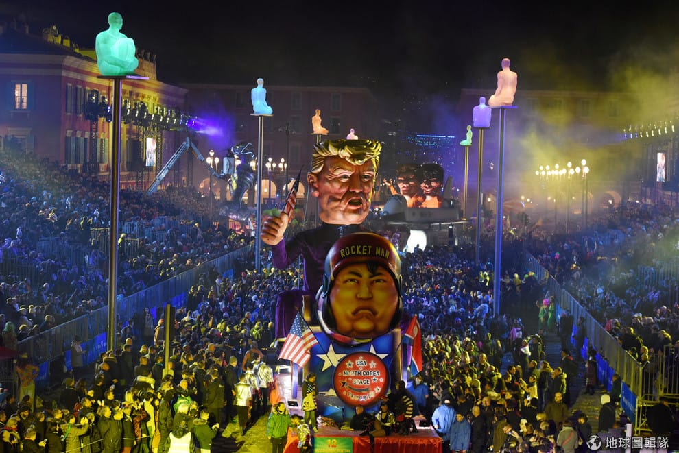 在尼斯第 134屆嘉年華遊行上,民眾推著美國總統川普(Donald Trump)和北韓領導人金正恩合體的花車入場,成為遊行中最不容錯過的焦點。