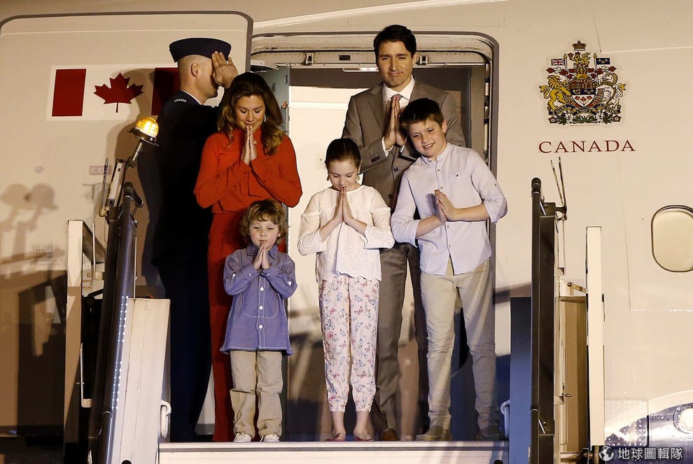 17號這天,加拿大總理杜魯道(Justin Trudeau,右二)一家飛抵印度參訪,他們在下機時雙手合十和迎接的印度官員與媒體打招呼。