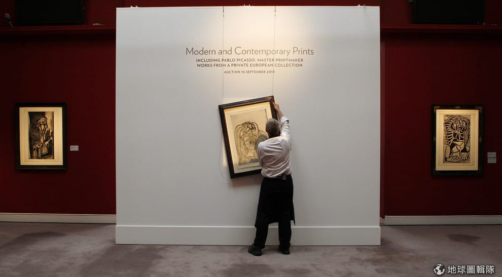 2010年 9月,一名畫廊人員掛起了準備要競標的畢卡索畫作。
