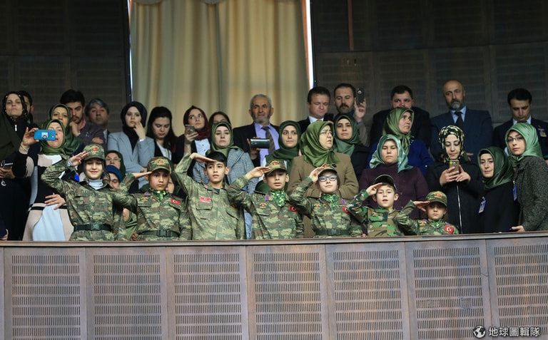 在安卡拉的國家議會,穿著迷彩服的小童軍對著進場演講的總統埃爾多安(Tayyip Erdogan)敬禮。
