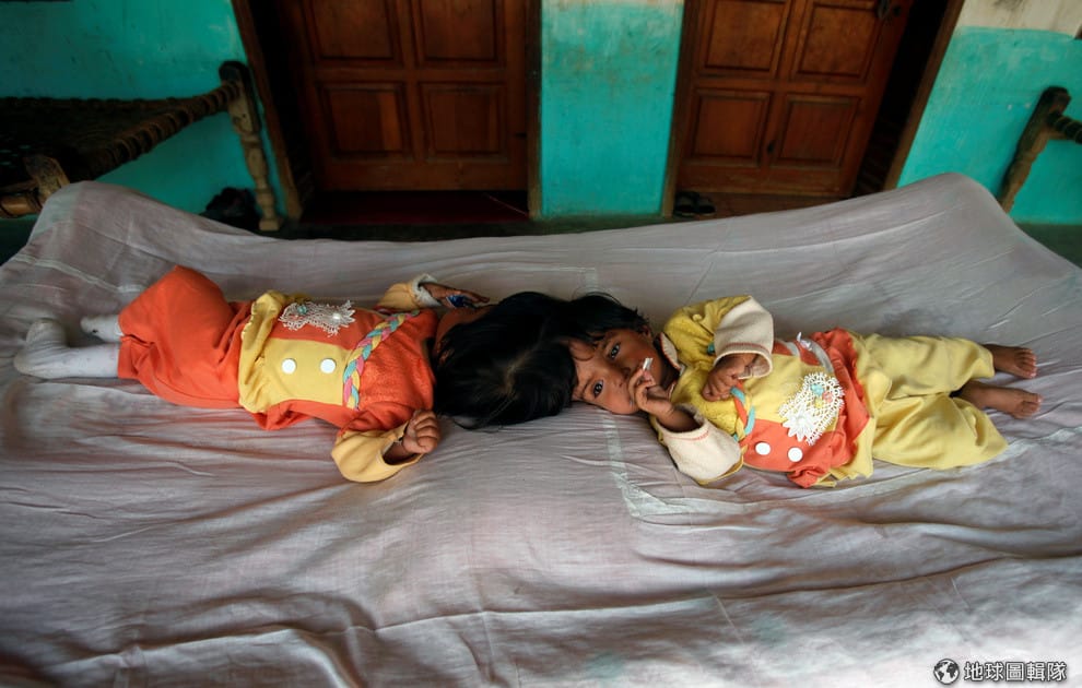 在巴基斯坦北方的賈爾瑟達(Charsadda,),一對連體嬰姊妹躺在床上。