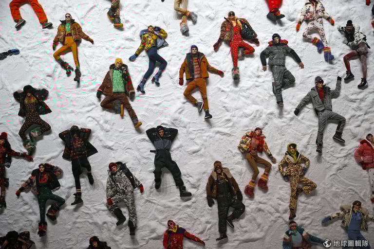 在米蘭時裝周上,模特兒穿著最新一季的服飾躺在白色的雪地上拍照。