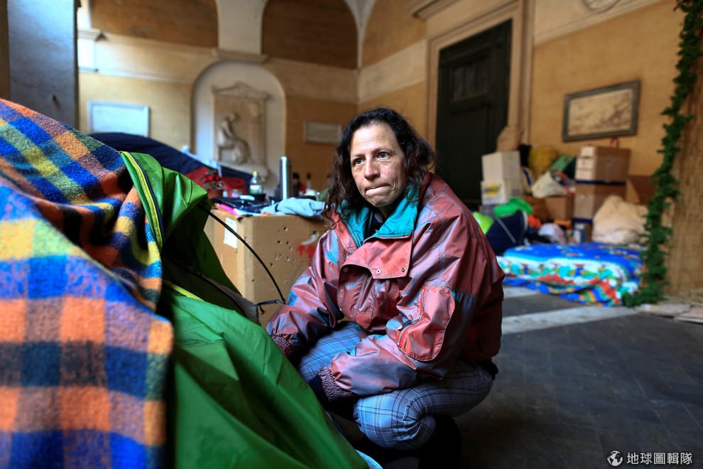 在羅馬十二宗徒聖殿,被趕出無人公寓的格羅西(Angela Grossi)待在她的帳篷旁,和許多無家可歸的遊民同在。