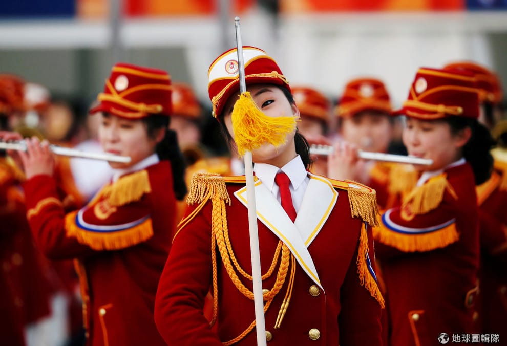 在平昌冬奧的獎牌廣場上,北韓啦啦隊員穿著鮮紅色的制服,為觀眾帶來精彩的樂儀隊表演。