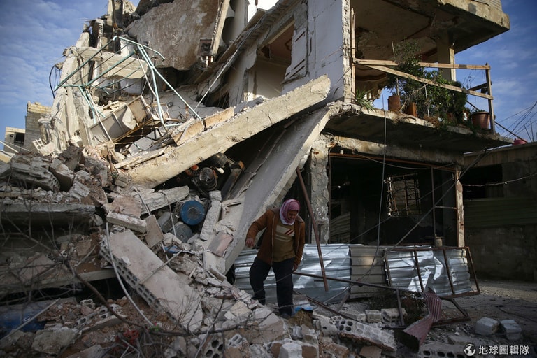 在鄰近首都大馬士革的東烏塔區(Eastern Ghouta),一名民眾正在斷垣殘壁中找尋遺留的物品。