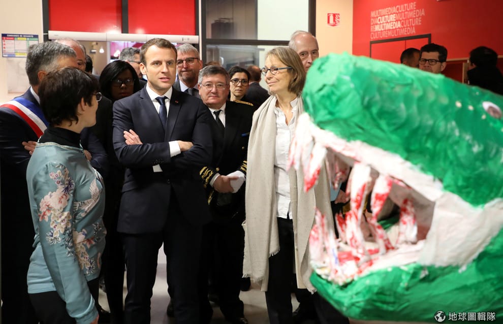 20號這天,法國總統馬克宏(Emmanuel Macron,中)在法國文化部長尼森(Francoise Nyssen,右)的陪伴下,參觀位於巴黎近郊的媒體中心。